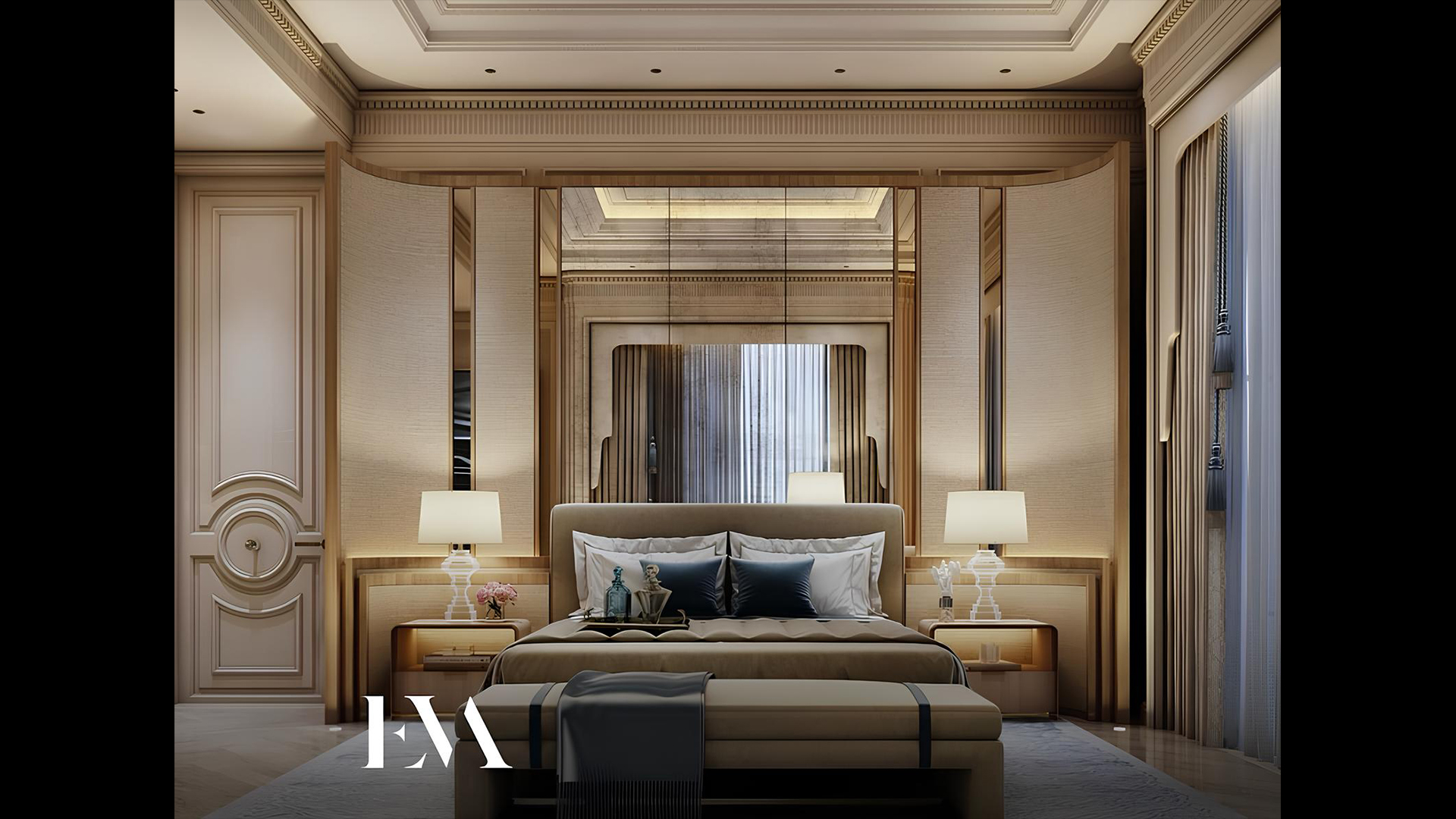 In the design of this master bedroom, we aimed to organize the space to maximize both functionality and aesthetic appeal. The biggest challenge was the bed's location adjacent to the door. We addressed this by introducing a curved, dividing wall that partitions the room into specific sections, providing a private space for the bed away from the traffic of the entrance. Layering on the walls draws the eye upward, complemented by a tinted mirror that adds depth and light to the room. Now, the passageway is clearly defined, and the storage area is strategically placed.